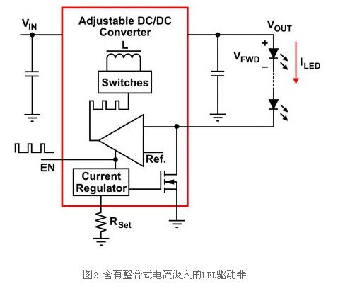 WLED亮度會(huì)隨著通過(guò)的電流而呈現(xiàn)直線變化,為使得各串行達(dá)到最佳的WLED電流準(zhǔn)確度及一致性亮度,LED驅(qū)動(dòng)器應(yīng)調(diào)節(jié)通過(guò)LED的電流電壓,而非調(diào)節(jié)LED兩端的電流電壓。圖1顯示如何在輸出大于LED正向電壓的總和且電壓(VLED)下降情況下,重新設(shè)定任何可調(diào)整輸出的電流調(diào)節(jié)直流對(duì)直流(DC-DC)轉(zhuǎn)換器成為穩(wěn)定電源,以驅(qū)動(dòng)串聯(lián)的多顆WLED。