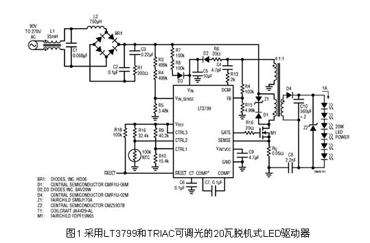 為了滿足脫機(jī)式照明的要求,例如高功率因子、高效率、隔離和TRIAC調(diào)光器兼容性,先前的LED驅(qū)動(dòng)器采用很多外部分立式組件,結(jié)果形成了既龐大又復(fù)雜的解決方案。而最新的驅(qū)動(dòng)器LT3799則整合了脫機(jī)式LED照明需要的所有功能,解決了相關(guān)復(fù)雜性、空間和效能問(wèn)題。LT3799是一款具主動(dòng)功率因子校正的隔離反馳式LED控制器,專門(mén)為在90~265VAC的通用輸入范圍驅(qū)動(dòng)LED而設(shè)計(jì)。該組件以關(guān)鍵導(dǎo)通(邊界)模式控制一個(gè)隔離反馳式轉(zhuǎn)換器,適用于需要4~100瓦或更高LED功率的LED應(yīng)用。其新穎的電流檢測(cè)電路無(wú)須使用光耦合器,就能向二次側(cè)提供良好調(diào)節(jié)的輸出電流。其獨(dú)特的泄能(Bleeder)電路使得LED驅(qū)動(dòng)器可與TRIAC調(diào)光器兼容,而無(wú)須增設(shè)額外的組件。LED開(kāi)路和短路保護(hù)則可確保長(zhǎng)期可靠性。