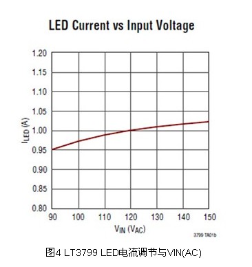 此外,LT3799在整個(gè)輸入電壓、輸出電壓和溫度范圍內(nèi)提供LED電流調(diào)節(jié)。從圖4可見(jiàn),正如大多數(shù)美國(guó)照明應(yīng)用所要求,當(dāng)輸入從90VAC變到150VAC時(shí),LED電流保持在±5%的調(diào)節(jié)范圍內(nèi)。LT3799采用一個(gè)獨(dú)特的電流檢測(cè)電路取代了光耦合器,以向二次側(cè)提供良好調(diào)節(jié)的電流。此舉不僅降低了成本,還改善了可靠性。
