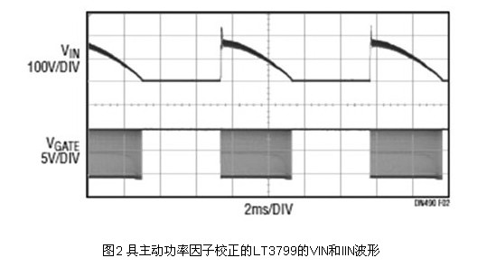 透過(guò)使線路電流跟隨施加的正弦波電壓,這種高功能整合的驅(qū)動(dòng)電路實(shí)現(xiàn)了高功率因子,并且滿足了IEC 61000-3-2 C類照明設(shè)備諧波要求。如果所吸取的電流與輸入電壓成正比,就能實(shí)現(xiàn)等于1的功率因子。其用一個(gè)從輸入電壓產(chǎn)生并與輸入電壓成比例的電壓調(diào)制峰值開(kāi)關(guān)電流。如圖2所示,這種方法提供0.98或更高的功率因子。一個(gè)小帶寬回饋環(huán)路保持對(duì)輸出電流的調(diào)節(jié),而且不會(huì)使輸入電流失真。