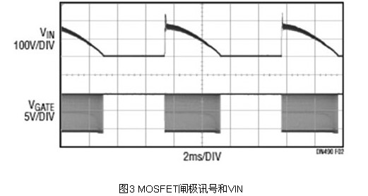 當(dāng)TRIAC調(diào)光器處于斷開(kāi)狀態(tài)時(shí),其實(shí)不是徹底斷開(kāi)的。有相當(dāng)大的漏電流通過(guò)其內(nèi)部濾波器流至LED驅(qū)動(dòng)器。這個(gè)電流為L(zhǎng)ED驅(qū)動(dòng)器的輸入電容器充電,進(jìn)而導(dǎo)致LED隨機(jī)開(kāi)關(guān)和閃爍。過(guò)往的解決方案是增加一個(gè)泄能電路,該電路包括一個(gè)大且昂貴的高壓金屬氧化物半導(dǎo)體場(chǎng)效晶體管(MOSFET)。LT3799將變壓器一次側(cè)繞組和主開(kāi)關(guān)用作泄能電路,因此無(wú)需這類MOSFET或其他任何額外的組件。如圖3所示,當(dāng)TRIAC斷開(kāi)時(shí),MOSFET閘極訊號(hào)為高,且MOSFET接通,進(jìn)而泄放掉漏電電流,并保持輸入電壓為 0伏特(V)。TRIAC一導(dǎo)通,MOSFET就無(wú)縫地變回正常的供電組件。