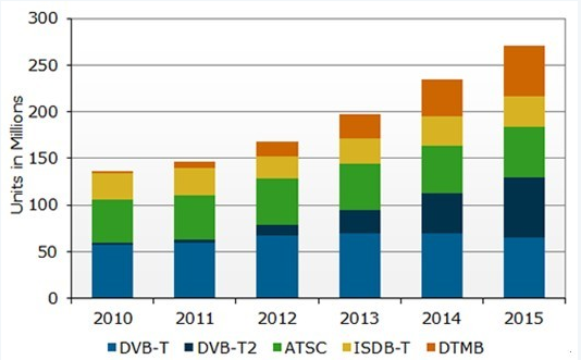 “到2015年,DVB-T和DVB-T2電視的出貨量將處于相當(dāng)水平,”Gray繼續(xù)說到,“俄羅斯和印度政府轉(zhuǎn)向T2的決定給行業(yè)注入強(qiáng)心劑,并將推動(dòng)成本下降,促進(jìn)新一輪電視應(yīng)用。”