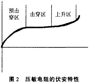 當(dāng)電路中出現(xiàn)雷電感應(yīng)過電壓或瞬態(tài)操作過電壓Vs 時, 保護(hù)電路和被保護(hù)的設(shè)備(或者線路中的元器件) 同時承受了過電壓Vs ,由于壓敏電阻(保護(hù)電路的核心元件) 的響應(yīng)速度快,他以納秒級的時間迅速呈現(xiàn)優(yōu)良的非線性導(dǎo)電特性(圖2 中的擊穿區(qū)) ,使壓敏電阻其兩端的電壓迅速下降,遠(yuǎn)遠(yuǎn)低于Vs 值,有效地將過電壓限制在被保護(hù)設(shè)備或被保護(hù)元器件的絕緣耐壓值等級下,從而使電子鎮(zhèn)流器免受過電壓的傷害。保證了電子鎮(zhèn)流器不因電源中瞬時過電壓而影響其性能或受傷害。