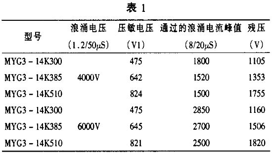 在選擇壓敏電阻器時,要充分考慮電子鎮(zhèn)流器的實際工作環(huán)境因素,滿足線路的安全防護(hù)要求。表1 為部分不同型號的壓敏電阻器在不同浪涌電流峰值下的殘壓試驗情況,從表中可以看出,選擇的壓敏電壓值越高,殘壓越高(相同峰值電流情況下) ,同一型號的壓敏電阻器經(jīng)受的峰值電流越大,殘壓也會有所加大。