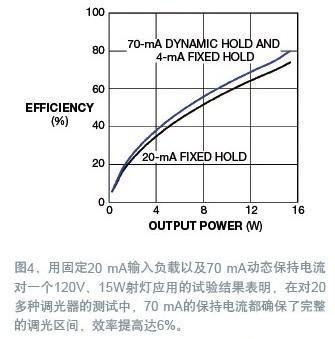 LM3450采用了這種采樣相位解碼器方法,因此只有在采樣周期內(nèi),動態(tài)保持才有效。為驗證這個方案,同時用一個固定的20 mA保持電流和一個大得多的70 mA動態(tài)保護電路,做了一個120V、15W的射燈應(yīng)用(圖4)。在對20多種調(diào)光器的測試中,70 mA動態(tài)保持法都確保了完整的調(diào)光區(qū)間,效率提高達6%。
