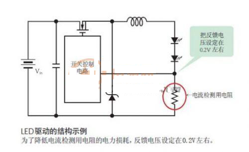 通常,開關穩(wěn)壓器IC設定的反饋電壓約為1.2V。但對于LED驅動IC,1.2V過大。因為把輸出電流轉換成電壓的數百mΩ 的電阻(電流檢測用電阻)需要與LED串聯(lián)。對于照明器具等使用的高亮度LED,流經的是1.5A和2A等大電流。如果500mΩ的電流檢測用電阻中通過1.5A的電流,僅此一項就會產生0.75W的電力損耗。因此,LED驅動IC把反饋電壓設定在了非常低的0.2V左右。這樣一來,不僅可以使用較小的電流檢測用電阻,而且在大電流通過時,也可以把電力損耗控制在較低的水平。