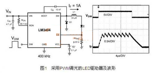 無(wú)論LED是經(jīng)由降壓、升壓、降壓/升壓或線性穩(wěn)壓器驅(qū)動(dòng),連接每一個(gè)驅(qū)動(dòng)電路最常見的線程就是須要控制光的輸出?,F(xiàn)今僅有很少數(shù)的應(yīng)用只需要開和關(guān)的簡(jiǎn)單功能,絕大多數(shù)都需要從0~100%去微調(diào)亮度。目前,針對(duì)亮度控制方面,主要的兩種解決方案為線性調(diào)節(jié)LED的電流(模擬調(diào)光)或在肉眼無(wú)法察覺(jué)的高頻下,讓驅(qū)動(dòng)電流從0到目標(biāo)電流值之間來(lái)回切換(數(shù)字調(diào)光)。利用脈沖寬度調(diào)變(PWM)來(lái)設(shè)定循環(huán)和工作周期可能是實(shí)現(xiàn)數(shù)字調(diào)光的最簡(jiǎn)單的方法,原因是相同的技術(shù)可以用來(lái)控制大部分的開關(guān)轉(zhuǎn)換器。