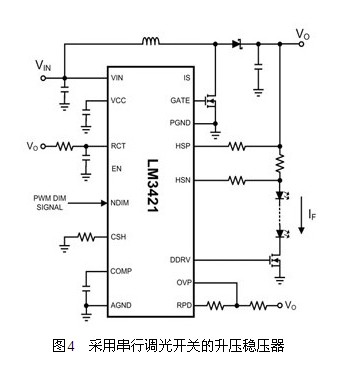 假如真的需要一個(gè)快速的PWM調(diào)光,最佳的解決方案是采用兩級(jí)系統(tǒng),并以降壓穩(wěn)壓器作為第二級(jí)LED驅(qū)動(dòng)級(jí)。不過(guò),若尺寸空間和成本都不容許,退而求其次的最佳選擇便是圖4中的串行開關(guān)。