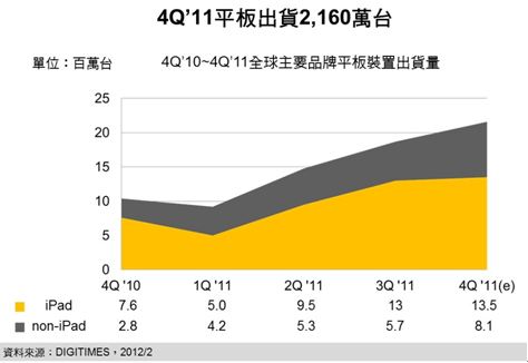 盡管多家業(yè)者受庫存與新品計(jì)劃延遲所困,但在iPad與低價(jià)Tablet強(qiáng)攻下,2011年第4季全球品牌Tablet出貨達(dá)2,160萬臺,季成長15.8%,年成長107.5%,高于原先估計(jì)??偨Y(jié)2011年,全球品牌Tablet出貨達(dá)6,328萬臺,iPad獲得約65%占比,Android Tablet則約30%。