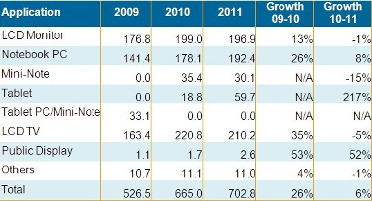筆記本電腦與公共顯示器依舊維持較佳表現(xiàn),分別有8%與52%的出貨成長。平板電腦尤其是蘋果iPad的強勁出貨態(tài)勢,使平板電腦面板在2011年出貨接近6千萬片,較2010年大幅成長21%。