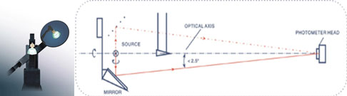 圓周運動反射鏡式其運作方式如圖11,待測燈僅自轉不須做大范圍的繞行,相對于中心旋轉反射鏡式的配光曲線較為穩(wěn)定,但根據(jù)CIE-70的規(guī)定,入射到偵測器的主光線應被限制在2.5度內(nèi),因此須要將量測距離拉長才可滿足此要求,但對于光線較弱的小型光源,如此長的量測距離,可能受限偵測器的靈敏度,不易量測。