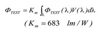 yaux,TEST (λ)為不點亮待測樣品,點亮輔助燈,在此系統(tǒng)下的光譜輻射計的讀值;yaux,REF (λ)則為不點亮參照標準燈,點亮輔助燈時,在此系統(tǒng)下的光譜輻射計讀值。從測得的ΦTEST (λ)(單位:W/奈米)總分光輻射通量,可使用公式(3)計算總光通量 ΦTEST (單位:流明)。