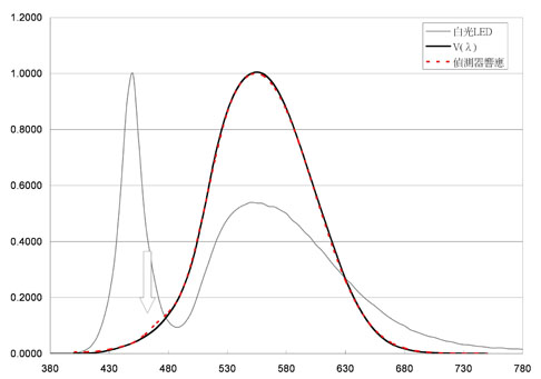 圖5 白光LED多以藍光激發(fā)黃色熒光粉,在藍光波段(圖中箭號表示)處,亮度計探頭的視效函數(shù)(虛線表示)響應與CIE V(λ)匹配不佳時,差異的比例就會加大。