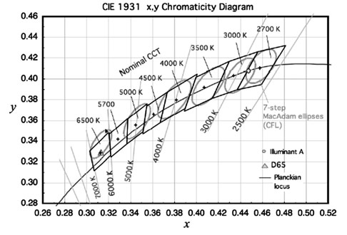 此規(guī)范包含美國國家標準中針對固態(tài)照明產(chǎn)品的光色特性規(guī)格定義,適用于室內(nèi)使用的燈具,不包括戶外燈具。其中,重點有兩部分,其一是定義相對色溫(CCT)的分級,其次是針對同一相對色溫標稱等級其允許的色溫變異范圍作定義。