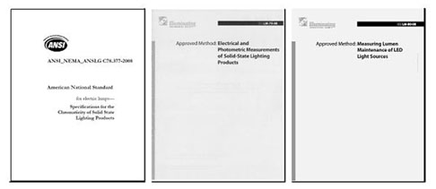 美國能源之星(Energy Star)已陸續(xù)發(fā)布針對固態(tài)照明產(chǎn)品的檢測規(guī)范定義,文件當中包含檢測項目、檢測方法依據(jù)的規(guī)范、須檢測的樣品數(shù)量及合格判定的規(guī)格數(shù)值,另外對于可進行測試的授權實驗室也有明確說明。在能源之星對固態(tài)照明產(chǎn)品測試所引用的規(guī)范當中,異于傳統(tǒng)照明的部分,包含ANSI C78.377-2008、北美照明協(xié)會(IESNA)LM-79-08、IESNA LM-80-08三份規(guī)范(圖1),本篇文章將僅就ANSI C78.377-2008及IESNA LM-79-08的檢測細節(jié)進行說明,并針對檢測所需的儀器設備原理介紹。