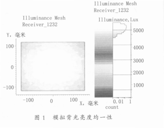 采用STAMPER 技術,一體成型射出導光板,減少印刷環(huán)節(jié),較少印刷污染。以模具射出形成網(wǎng)點,入射面設計能破壞光源的全反射,并控制光源射出導光板面角度的分布,網(wǎng)點數(shù)量的多少對光源做有效的控制。網(wǎng)點可隨模具任意設計形狀,若網(wǎng)點為極小的平滑鏡面,可使光在網(wǎng)點及導光板內部的損失減至最小,應用光學設計軟件進行網(wǎng)點設計。圖1 所示為模擬的背光組件的亮度均一性。