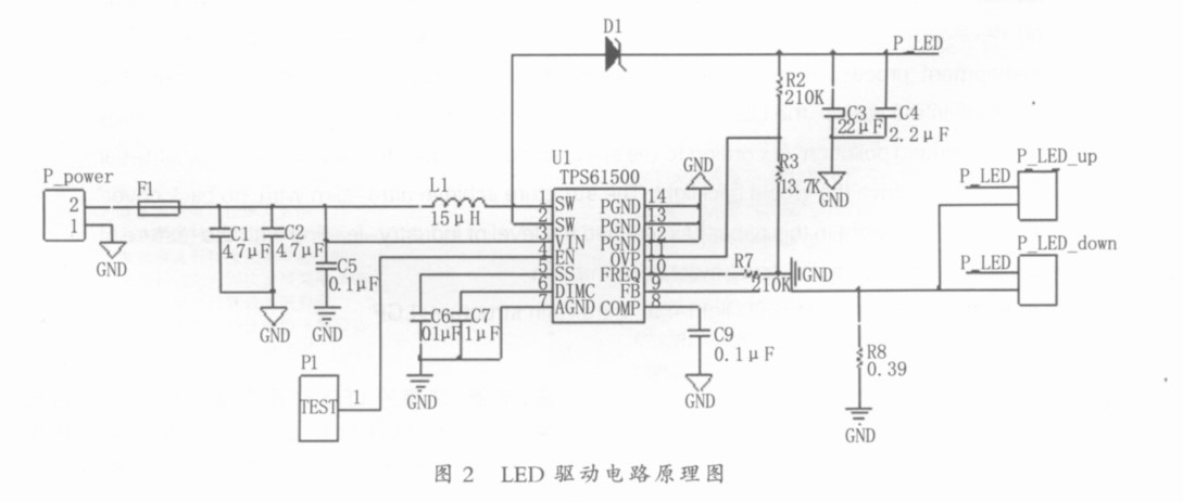 在側光式背光組件中, 應用長條式的LEDlight- bar 作為整個組件的光源,LED light- bar 采用白光頂發(fā)光LED.以某機種產(chǎn)品為例,單顆功耗:3.2V×0.02A=0.064W.整個light- bar 功耗:0.064W×42=2.69W.LED 背光源電路設計主要包括發(fā)光條設計和驅動控制電路設計,驅動電路采用一款DC/DC 恒流驅動芯片,對發(fā)光條進行恒流驅動。圖2 所示為LED light- bar 的驅動原理圖。