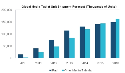 據(jù)IHS iSuppli公司,2012年全年蘋果占全球媒體平板電腦出貨量的份額預(yù)計(jì)為61%,高于2011年第四季度時(shí)的57%。雖然蘋果2012年全年市場(chǎng)份額將略低于2011年的62%,但它將在媒體平板電腦市場(chǎng)保持統(tǒng)治地位,直到2014年,屆時(shí)其出貨量份額仍將高達(dá)52%。