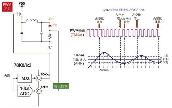 第二種是通過A/D轉換器進行反饋控制,使用A/D轉換器檢測LED電流,通過改變PWM輸出占空比實現(xiàn)恒流控制。通過改變A/D轉換的目標值實現(xiàn)各通道的獨立調光,如圖3所示。