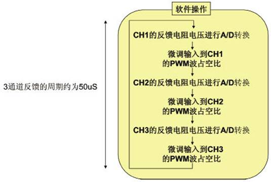 LED恒流控制操作流程圖如圖4所示,如圖,有3通道的LED需要控制,是A/D轉換→PWM輸出的微調的重復操作。軟件操作過程是對CH1的反饋電阻電壓進行A/D轉換,微調輸入到CH1的PWM波占空比,然后對通道2和通道3進行同樣操作,重復上述流程即可。三個通道的A/D轉換和檢測調整的整個周期約為50μs。