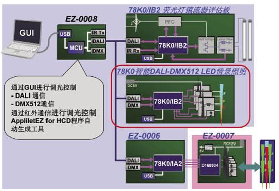瑞薩電子的照明參考方案由3部分組成,可通過PC端GUI進行調光控制,PC和通信板通過USB線連接,情景照明板和通信板之間可以由紅外、DALI及DMX512三種方式實現(xiàn),在瑞薩電子的照明參考方案中,可以使用AppliletEZ for HCD程序自動生成工具,實現(xiàn)照明控制程序的涉及、編譯和燒寫。照明參考方案如圖5所示。