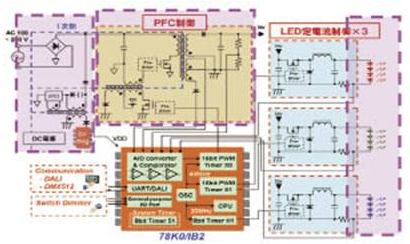 基于78K0/IB2 LED路燈方案如圖8所示??蓪崿F(xiàn)AC220V,具有 PFC;驅動總功率60W;調光通信接口可采用RS485/PLC接口。