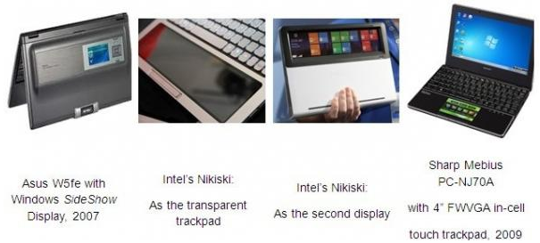 除了將觸控導(dǎo)入于筆記本電腦屏幕外,從過(guò)去到現(xiàn)在也一直有新的創(chuàng)意想法在開(kāi)發(fā)、進(jìn)行中。過(guò)去當(dāng)Windows Vista問(wèn)世時(shí),SideShow的功能讓筆記本電腦多了一個(gè)小屏幕(如Asus W5fe)。雖然當(dāng)時(shí)并不是觸控屏幕而是采實(shí)體按鍵,但對(duì)于一些簡(jiǎn)單的操作目的(像是信件、日程、音樂(lè)播放等),用戶就不需要打開(kāi)筆記本電腦、而直接于這個(gè)小屏幕操作。后來(lái)的創(chuàng)意還有像是:SHARP將In-Cell內(nèi)嵌式觸控面板導(dǎo)入筆記本電腦的觸摸板,以及Intel于2012年CES展中所揭示的Nikiski概念。Nikiski在正常鍵盤輸入時(shí)可充當(dāng)觸摸板,合起來(lái)時(shí)又如同SideShow的附加屏幕,不過(guò)卻可以觸控支持Metro接口的使用。受限于當(dāng)時(shí)時(shí)空環(huán)境里消費(fèi)者使用情境、相關(guān)技術(shù)、成本等因素的成熟度與配合,這些創(chuàng)意或其衍伸當(dāng)時(shí)并未真正導(dǎo)入市場(chǎng),不過(guò)這并不代表這些創(chuàng)意未來(lái)就沒(méi)有面市的可能性。