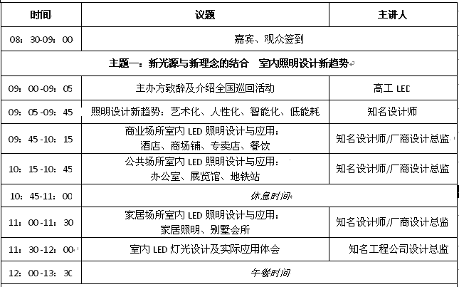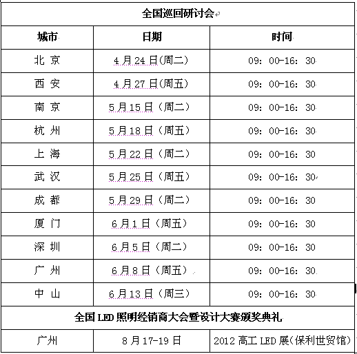 整個(gè)巡回研討會(huì)暨大賽將持續(xù)5個(gè)月時(shí)間,3月份為活動(dòng)啟動(dòng)宣傳階段,4-5月份為全國(guó)巡回研討及大賽報(bào)名階段,6‐8 月份為大賽作品提交及評(píng)審階段。巡回總結(jié)大會(huì)暨設(shè)計(jì)大賽頒獎(jiǎng)典禮將于2012 高工LED 展期間(8 月17 日)在廣州保利世貿(mào)館召開(kāi)。