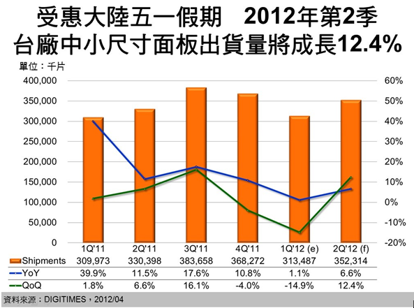 第2季為中小尺寸TFT LCD面板傳統(tǒng)旺季的開始,其中,大陸五一假期需求更是第2季的主要市場(chǎng)動(dòng)力來(lái)源,DIGITIMES Research分析師楊仁杰分析,2012年第2季臺(tái)廠中小尺寸TFT LCD出貨量預(yù)估將為3.52億片,將較前季成長(zhǎng)12.4%。至于年成長(zhǎng)率,則受惠大陸手機(jī)市場(chǎng),尤其是智能型手機(jī)市場(chǎng)帶動(dòng),加上臺(tái)廠打入國(guó)際大廠7吋平板裝置、教育學(xué)習(xí)機(jī)、打印機(jī)等應(yīng)用,將較2011年第2季成長(zhǎng)6.6%。