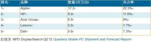 平板電腦為蘋果公司的Mobile PC出貨增溫,使得今年第一季的市占率達到22.5%,將近HP市占率的兩倍,其它前五大品牌則是由筆記本電腦出貨量決定排名。