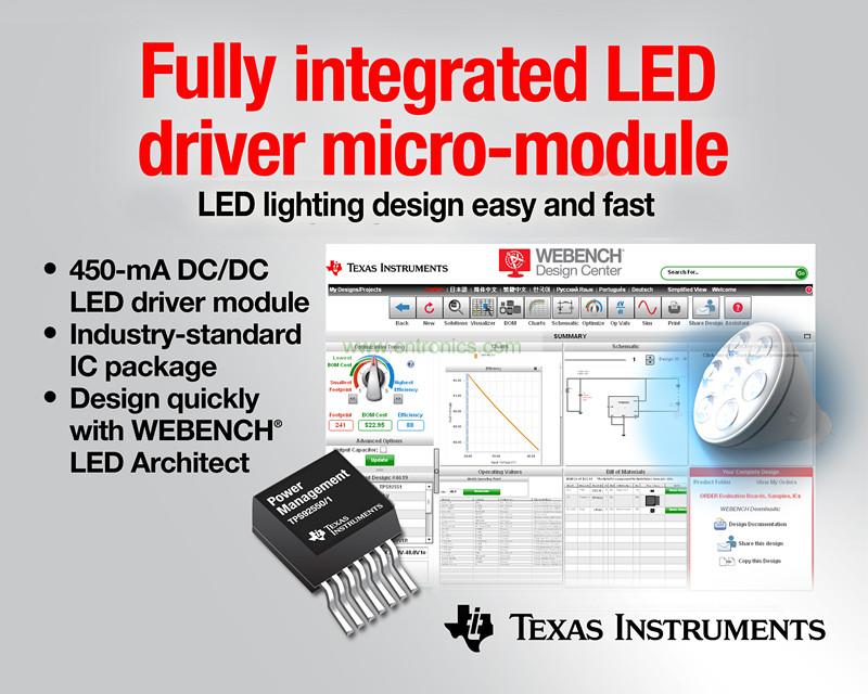 日前,德州儀器 (TI) 宣布推出兩款全面集成型 LED 驅(qū)動(dòng)器微型模塊,其可消除 LED 驅(qū)動(dòng)器設(shè)計(jì)中常見的外部組件及復(fù)雜布局安放問題。該 450 mA TPS92550 及 TPS92551 DC/DC LED 驅(qū)動(dòng)器模塊是業(yè)界率先采用統(tǒng)一 IC 封裝集成所有所需電源及無源電路系統(tǒng)的產(chǎn)品,可為 LED 實(shí)現(xiàn)高達(dá) 23 W 的功率。如欲了解更多詳情,訂購樣片與評(píng)估板,敬請(qǐng)?jiān)L問:http://www.ti.com.cn/product/cn/tps92550。觀看視頻,請(qǐng)點(diǎn)擊:http://www.ti.com/tps92550-prv。
