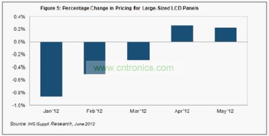 5月份,大于10.x英寸的大尺寸液晶面板平均價格上漲0.2%,連續(xù)第二個月上升。4月上漲了0.3%。盡管過去兩個月價格漲幅很小,但與2月和3月的下滑相比,仍然有所改善,如圖5所示。