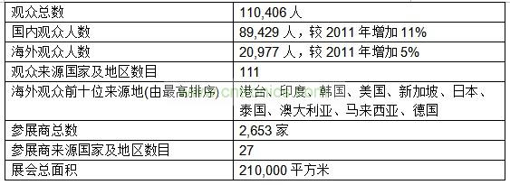 第十七屆「廣州國(guó)際照明展覽會(huì)」展覽面積達(dá)21萬(wàn)平方米,規(guī)模較2011年增長(zhǎng)5%,參展企業(yè)2653家,比上屆減少9%,參展企業(yè)來(lái)自全球27個(gè)國(guó)家和地區(qū)。本屆展會(huì)觀眾數(shù)目同創(chuàng)新高,吸引了110,406名觀眾,較2011年增長(zhǎng)10%,分別來(lái)自111個(gè)國(guó)家及地區(qū),其中國(guó)內(nèi)專(zhuān)業(yè)觀眾89,429人,較2011年增加11%,海外專(zhuān)業(yè)觀眾20,977人,較2011年增加5%,海外觀眾前十位來(lái)源地分別是港澳臺(tái)地區(qū)、印度、韓國(guó)、美國(guó)、新加坡、日本、泰國(guó)、澳大利亞、馬來(lái)西亞和德國(guó)。大會(huì)同期舉辦的各類(lèi)技術(shù)研討會(huì)、產(chǎn)業(yè)高峰論壇、產(chǎn)品推介會(huì)、交易節(jié)等高水平會(huì)議、論壇交流活動(dòng)多達(dá)110多場(chǎng)次,較去年增加10場(chǎng),亦創(chuàng)新高。