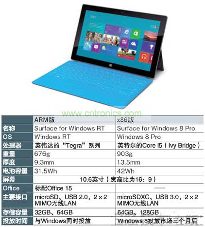 微軟的平板終端名為“Surface”,微軟讓Windows 8平板終端繼承了支持觸摸操作的桌面型計算機的名稱。新款終端備有配備ARM架構(gòu)SoC的“Surface for Windows RT”,以及配備x86處理器的“Surface for Windows 8 Pro”兩款機型,前者將與Windows 8同時上市(圖1)。