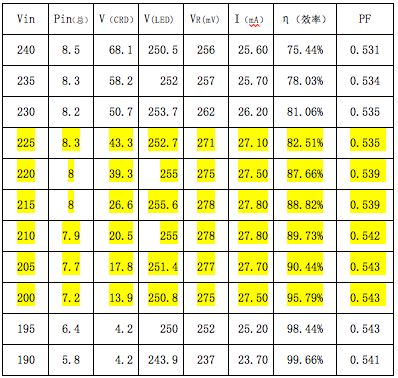 下面舉一個實(shí)測的結(jié)果為例,這是一個80顆3014串聯(lián)的球泡燈,采用了5顆Semitek 的S-562T并聯(lián)。它在不同的輸入市電電壓時,所測得的結(jié)果如下表所示。
