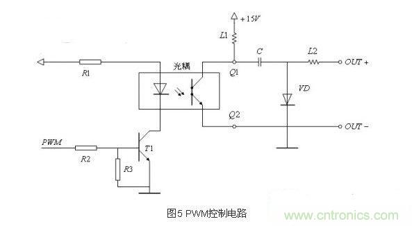 限于篇幅有限,下面僅對此PWM控制電路進行簡單的介紹:當(dāng)PWM控制信號為低電平時,晶體管T1處于截止?fàn)顟B(tài),光電耦合器中發(fā)光二極管的電流近似為零,輸出端Q1和Q2間的電阻很大,相當(dāng)于開關(guān)“斷開”;當(dāng)PWM波控制信號為高電平時,晶體管T1處于導(dǎo)通狀態(tài),光電耦合器中發(fā)光二極管發(fā)光,輸出端Q1和Q2間的電阻很小,相當(dāng)于開關(guān)“導(dǎo)通”.由上面介紹可知,當(dāng)DS18B20采集的實時溫度小于制冷啟動溫度時,光電耦合器的PWM輸入端無信號輸入時,光電耦合器處于不工作狀態(tài),圖5中的OUT+端和OUT-端無輸出電壓,即半導(dǎo)體制冷片處于閑置狀態(tài);當(dāng)DS18B20采集的實時溫度大于制冷啟動溫度時,光電耦合器的PWM輸入端有信號輸入,圖5中的OUT+端和OUT-端即有輸出電壓。通過PWM調(diào)制波控制Q1和Q2兩端的通斷,即可實現(xiàn)對半導(dǎo)體制冷片TEC工作電壓的控制,進而控制了半導(dǎo)體制冷片TEC的散熱功率。圖5中的OUT+端和OUT-端分別接在半導(dǎo)體制冷片TEC的輸入端線上。根據(jù)CUK電路的輸出電壓和供電電源電壓的關(guān)系,可得出PWM波占空比和半導(dǎo)體制冷片TEC輸入電壓的關(guān)系: