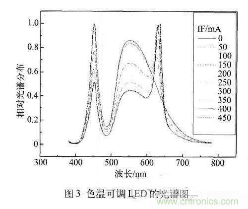 圖3為采用遠(yuǎn)方HASS-2000高精度快速光譜輻射計(jì)測(cè)量得到的色溫可調(diào)LED的光譜圖,從圖中可以看出,隨著紅光LED電流的變化(從0到450mA),LED的相對(duì)光譜也會(huì)隨之變化,LED的光譜有三個(gè)峰值,分別在450nm、550nm和628nm,暖色溫的發(fā)光效率大于68lm/W,冷色溫的發(fā)光效率達(dá)到87lm/W。