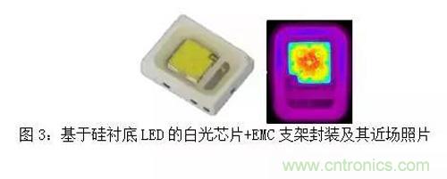 (3)垂直結(jié)構(gòu)的芯片,不僅可以采用陶瓷封裝工藝,也可以采用更為廉價(jià)的支架封裝方式,進(jìn)一步降低客戶的使用成本,如圖3所示,這為高品質(zhì)照明提供了無限的可能。利用硅襯底LED芯片,可實(shí)現(xiàn)照明品質(zhì)更佳、系統(tǒng)成本更低、設(shè)計(jì)方案更靈活、更具創(chuàng)新性的LED照明解決方案。