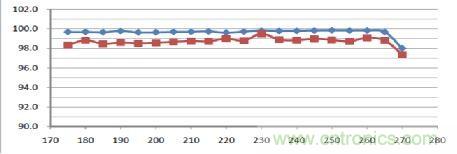 圖中的藍(lán)色為恒流源本身的效率,紅色為包括了整流器在內(nèi)的全部電源的效率。由圖中可見當(dāng)市電電壓從175V增加到265V時(shí),它的效率一直保持在99%以上。這樣高效率的恒流源,放到鋁基板上以后就基本上不會(huì)增加鋁基板的熱量,也就不會(huì)降低光引擎的熱光效,更不會(huì)降低光引擎的壽命了!此外它的效率也不隨溫度而變化: