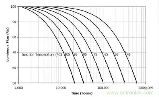 如果環(huán)境溫度是105℃,那么還至少要加上20℃才是結(jié)溫,所以結(jié)溫就大約是125℃。在這個(gè)曲線上已經(jīng)查不到了,只能大致地估算其壽命只有4,000小時(shí)。這是絕對(duì)不能接受的!也就是說,LED泡殼里的環(huán)境溫度必須大大低于105℃!