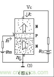 傳統(tǒng)講法一般分三步,以NPN型為例(以下所有討論皆以NPN型硅管為例),如示意圖A。1.發(fā)射區(qū)向基區(qū)注入電子;2.電子在基區(qū)的擴散與復(fù)合;3.集電區(qū)收集由基區(qū)擴散過來的電子。”(注1)