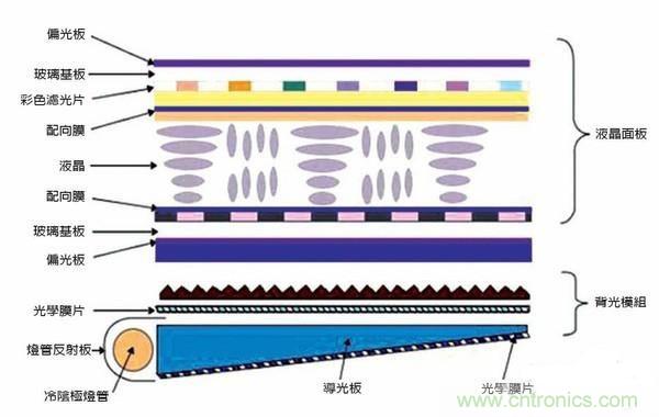 我們先來(lái)看看歷史已久的LCD顯示技術(shù),LCD顯示屏結(jié)構(gòu)非常復(fù)雜,LCD 的構(gòu)造是在兩片平行的玻璃基板當(dāng)中放置液晶盒,下基板玻璃上設(shè)置TFT(薄膜晶體管),上基板玻璃上設(shè)置彩色濾光片,通過(guò)TFT上的信號(hào)與電壓改變來(lái)控制液晶分子的轉(zhuǎn)動(dòng)方向,從而達(dá)到控制每個(gè)像素點(diǎn)偏振光出射與否而達(dá)到顯示目的。