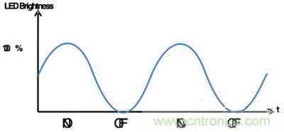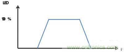我們?cè)诒疚拈_(kāi)始處通過(guò)筆記本電腦的電源鍵為例簡(jiǎn)單介紹了一下呼吸效應(yīng)。持續(xù)地逐漸提升或逐漸下降兩級(jí)之間的占空比能讓LED形成“呼吸”的效果,如圖6所示。待機(jī)模式下電源按鍵支持呼吸效應(yīng)能告訴用戶電源按鍵是活動(dòng)狀態(tài)并能進(jìn)行操作。