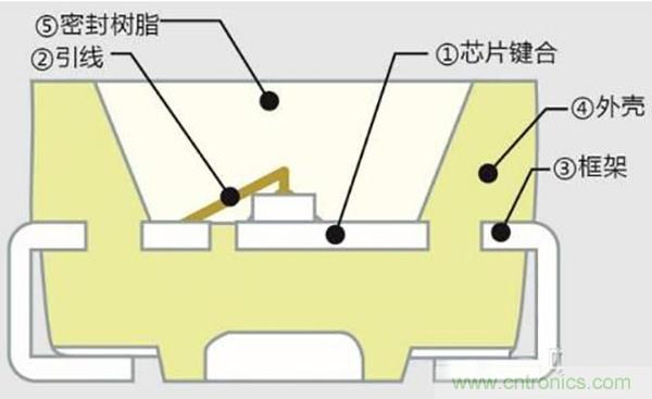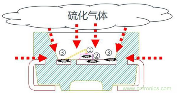 其中硫化氣體由密封樹脂/引線框架界面、引線框架/外殼界面、密封樹脂侵入,可能發(fā)生硫化的位置有4個位置: