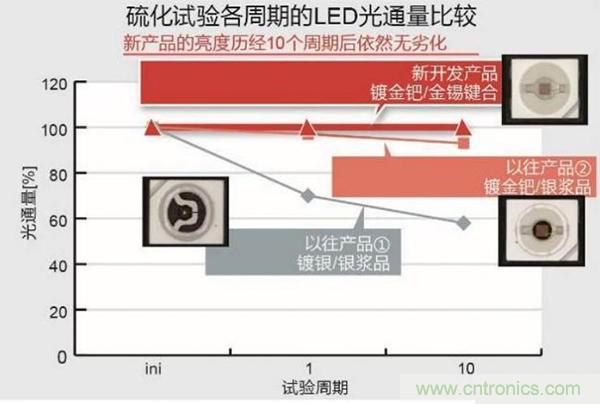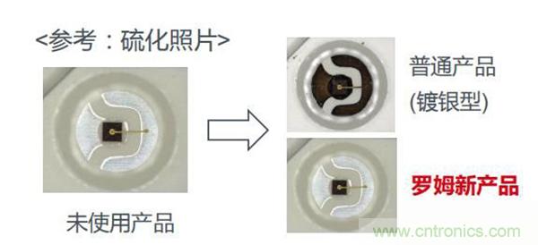 通過對比得出ROHM新產(chǎn)品的優(yōu)勢:一是能保持亮度,二保護(hù)芯片鍵合材料不受損壞,三無需其他保護(hù)對策。