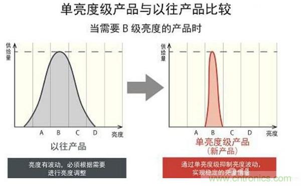 單亮度等級: 羅姆將ABCD即紅藍(lán)黃白的亮度更細(xì)分化,可從一般市場中的赤橙黃綠青藍(lán)紫細(xì)到17種顏色。