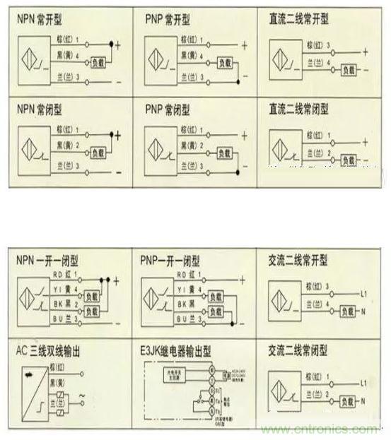 1)接近開關有兩線制和三線制之區(qū)別, 三線制接近開關又分為 NPN 型和 PNP 型,它們的接線是不同的。請見下圖所示: