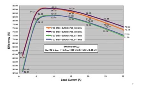 注意上面的兩條曲線,在滿載(30A)時,可以看到最新的器件的效率有1.5%的改進。同樣還是這兩條曲線,在負荷較小(15A)時,可以實現(xiàn)0.69%的改善。如果對整個負荷范圍積分,那么與今天常見的方案相比,使用最新的MOSFET器件時平均功率損耗可以降低8%~10%。即使在較高的開關頻率541kHz處,可以看到在負荷小時系統(tǒng)級效率仍然高于80%,而在滿載時效率大于70%。如果頻率繼續(xù)增加,那么開關損耗將急劇增加。