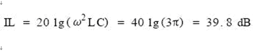 對于小功率的電子設(shè)備而言,LmaxCy,max的值通常為100μHμF,這是一個非常小的數(shù)值。以單級LC濾波器為例,為簡化分析,用電壓衰減來代替插入損耗,可得此時插入損耗為:
