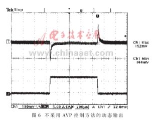 本文通過(guò)檢測(cè)輸出電感電阻的阻值,對(duì)其進(jìn)行適當(dāng)?shù)奶幚?,有效地?shí)現(xiàn)AVP控制(如圖5所示),避免了在電感與輸出端增加電阻所引起的效率下降問(wèn)題。圖5(b)和圖6為采用AVP控制方法和不采用AVP控制方法兩種情況下的實(shí)測(cè)動(dòng)態(tài)波形。輸出電流由空載到半載(0→7.5A)時(shí)測(cè)得輸出電壓峰-峰值為97mV,而不采用AVP控制方法時(shí)輸出電壓峰-峰值為318mV。而且圖5(b)的動(dòng)態(tài)恢復(fù)時(shí)間明顯比圖6的恢復(fù)時(shí)間短??梢?jiàn),采取AVP控制有著良好的動(dòng)態(tài)響應(yīng),進(jìn)而可減小輸出電容及降低成本。